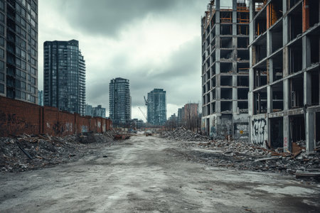 Captivating view of an abandoned construction site flanked by contemporary high-rise buildings, set against a dramatic and moody sky, reflecting urban change.