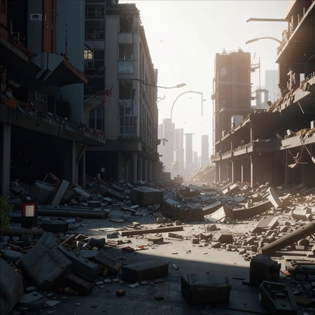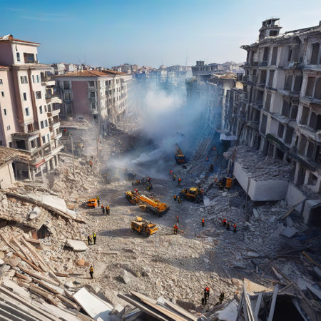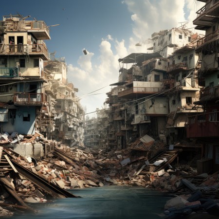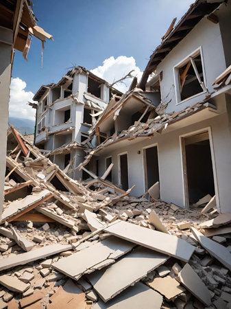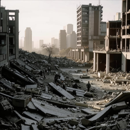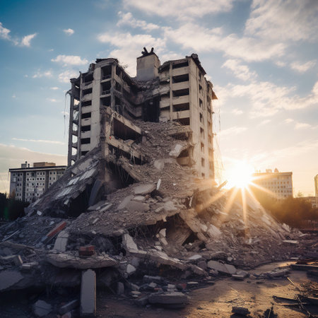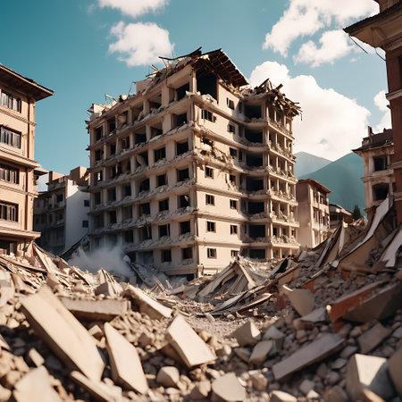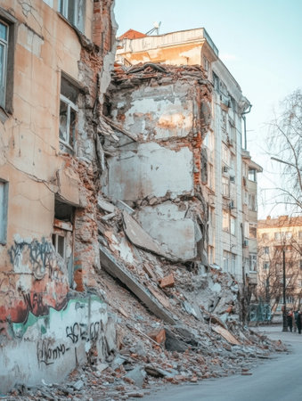 This image captures the aftermath of a calamitous event, showing a partially collapsed building surrounded by debris amidst an urban landscape.