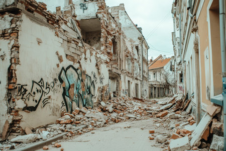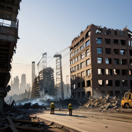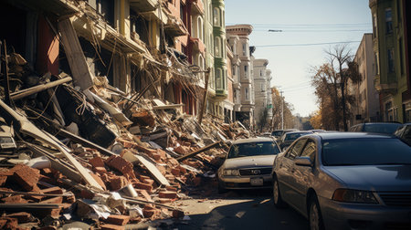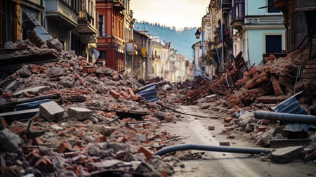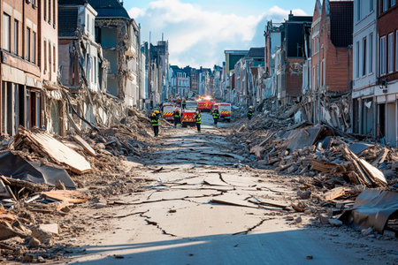 In a city left in ruins, emergency responders navigate debris-laden streets. Cracked pavement and damaged buildings reveal the harsh reality of the natural disaster. Hope rises amidst disaster.