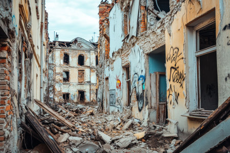 Cracked walls of abandoned buildings reveal layers of decay and neglect in a deserted urban area, offering space for text overlay.