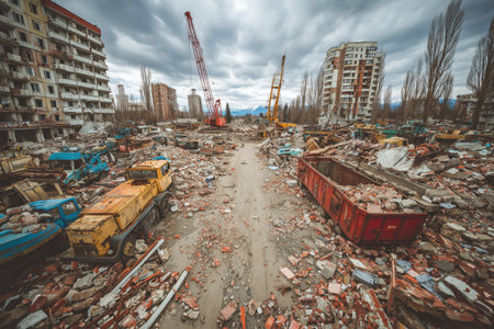 wide view of a dystopian city filled with debris, cranes, and destroyed buildings, symbolizing decay, survival, and futuristic ruin concepts. ai generated.