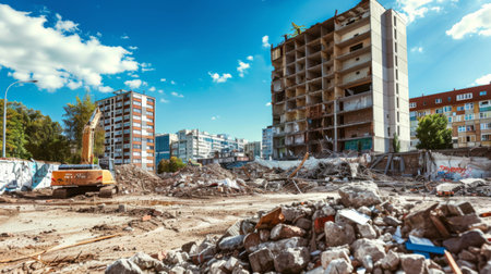 An aerial view captures a demolition site surrounded by towering apartment buildings, showcasing the remnants of a once-bustling community. The scene is filled with rubble and debris, while construction vehicles work diligently to clear the area, symbolizing change and urban renewal.