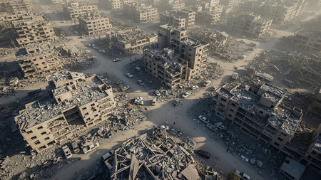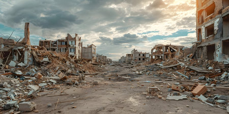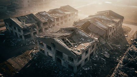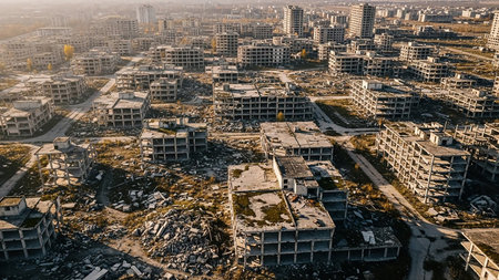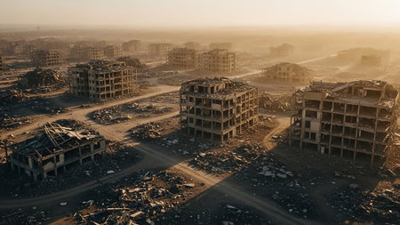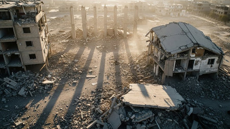 Hazy showing aerial view of a vast urban landscape devastated by destruction with piles of rubble and damaged buildings under a hazy sky and soft sunlight creating...