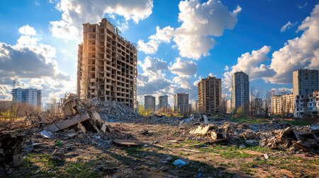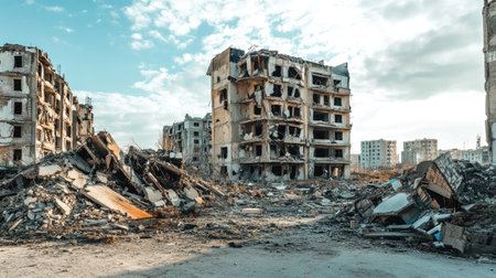 Illustrating devastation and suffering: Postwar rubble backdrop in the aftermath of conflict. Concept War photography, Postwar devastation, Conflict aftermath, Human suffering, Ruined landscapes