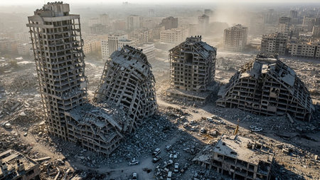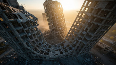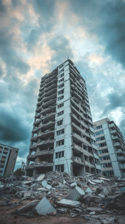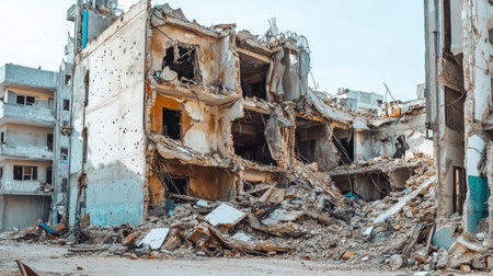 Powerful image showing ruins of a collapsed residential building in a cityscape, symbolizing destruction, loss, and the human cost of war and crisis
