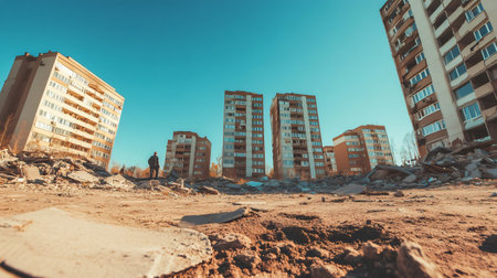 Geologist observes the aftermath of a devastating earthquake, assessing the structural damage to residential buildings amidst a scene of destruction and rubble under a clear blue sky