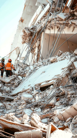 Rescue workers are inspecting a collapsed building after a devastating earthquake, highlighting the destructive power of seismic waves and the importance of disaster relief efforts