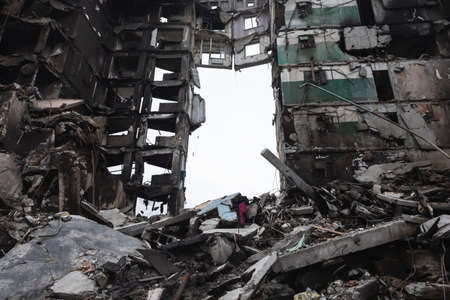 Photograph of destroyed buildings and houses due to the war. Mass destruction. Lifeless cities. Combat operations on the territory of civilians. Concrete, stones and glass shards.