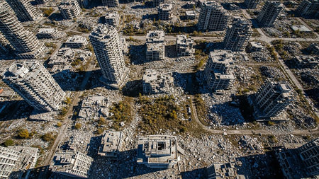 Aerial view of a city district in ruins with numerous concrete apartment buildings severely damaged, showing extensive structural decay.