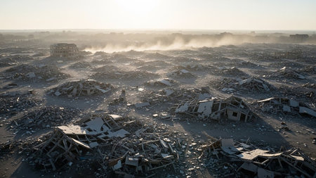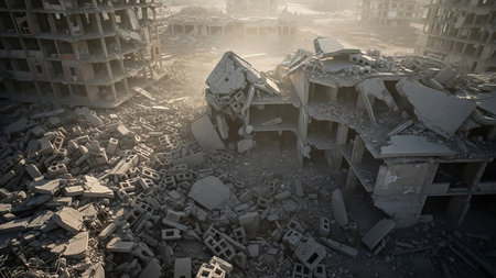 A desolate urban scene filled with collapsed concrete buildings, piles of rubble, and dust, conveying a sense of destruction and conflict.