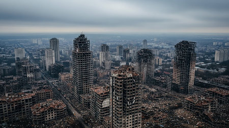 Perspective showing panoramic aerial view of a city devastated by conflict showing numerous high-rise buildings reduced to skeletal ruins amidst widespread debris...