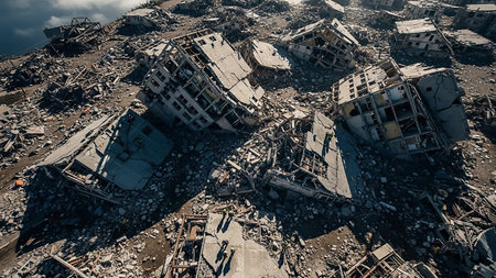Earthquake aftermath with collapsed concrete structures and rubble covering the ground.