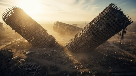 Tilted showing two massive cylindrical structures in ruins, tilted and broken, amidst a landscape of rubble and debris under a hazy, sunlit sky keywords: ruins,...