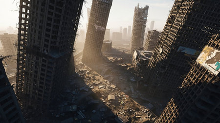 A post-apocalyptic cityscape with severely damaged, leaning skyscrapers and rubble-strewn streets under a hazy, sunlit sky.