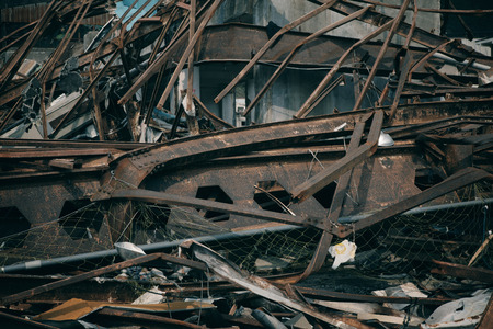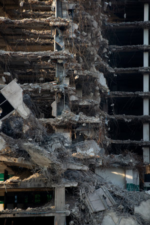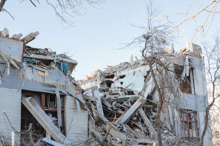 Demolition of a building, close-up. The wreckage of a demolished building.