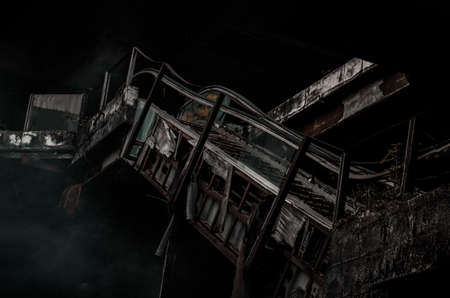 The destroyed big concrete building in a foggy haze. The remains of the frame of gray concrete piles and debris of the building structure. Background. Place to write the text.