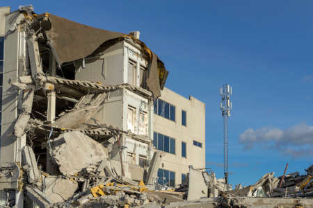 Earthquake damage in a city. Destroyed buildings after an earthquake. Selective focus included.