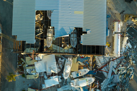 Hurricane Ian destroyed boat station in Florida coastal area. Natural disaster and its consequences