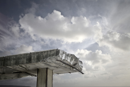 Grey concrete fragments of the Foundation against the background of a destroyed building against the sky. Background