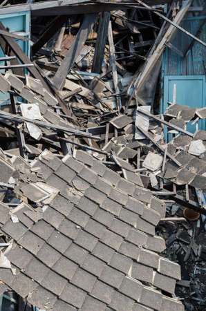 dismantling of an old building falling apart from cataclysm or old age, rubbish and rubbish, fragments of brick walls.