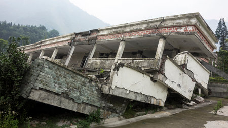 A building tilts dramatically after an earthquake, debris scattered across the street in a damaged urban environment.