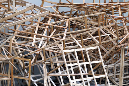 A pile of wooden sticks in a construction site beside a cements wall for texture and backgrounds.