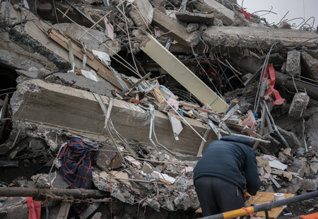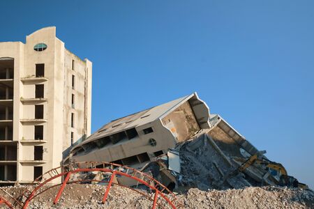 Building collapse. Debris and destroyed building that collapsed from an earthquake. Catastrophe. Ruined building. Rubble on the ground. Warzone. Catastrophic zone.