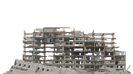 A pile of gray concrete debris against the remains of a large destroyed building and the blue sky. Background