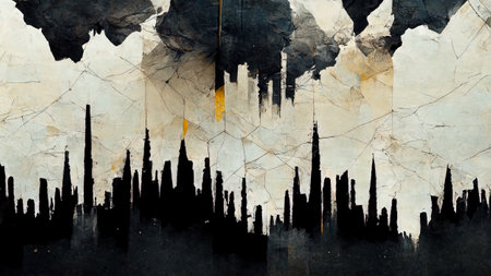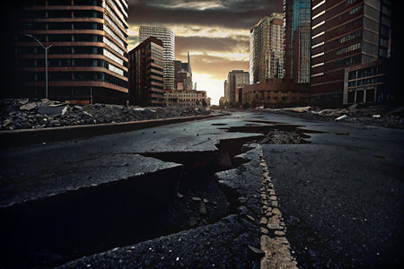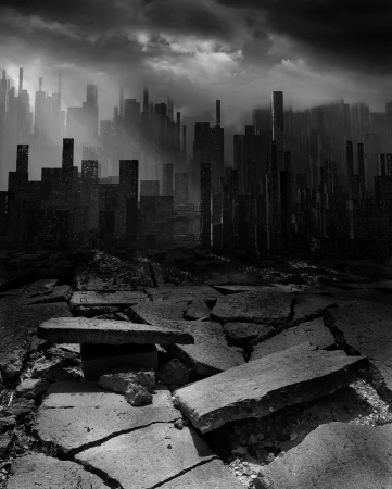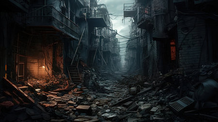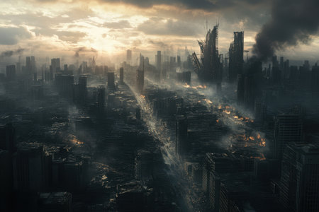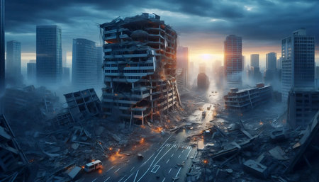 A haunting view of a desolate city with extensively damaged buildings under a dark, cloudy sky, creating an apocalyptic atmosphere in the ruins of an abandoned urban area. AI generated image