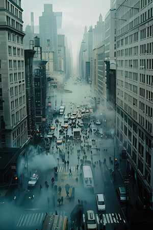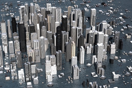 Apocalypses: huge tsunami, fire, earthquake destroy the downtown of a big modern city