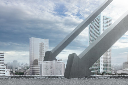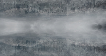 Flat design panoramic city skyline is showing dense high-rise towers under swirling storm clouds. Urban, metropolis, architecture, skyline, weather, dramatic, monochrome