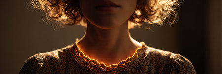Soft light illuminates the neckline of a woman in a detailed garment, creating a warm and inviting ambience in a dimly lit indoor space.