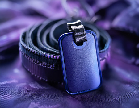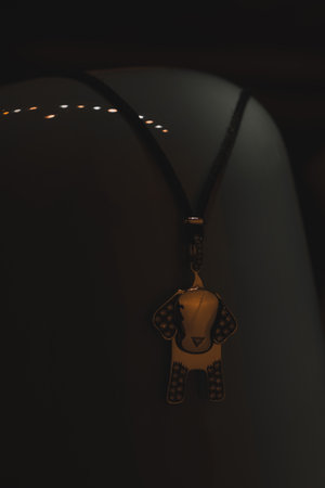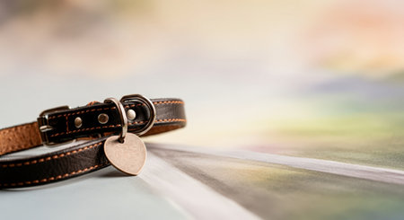 Close-up of a leather dog collar with a heart-shaped metal tag on a blurred background, symbolizing pet care and love for animals.