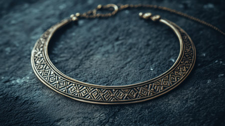 This exquisite antique bronze necklace features intricate patterns, displayed against a textured dark stone background, perfect for fashion showcases.