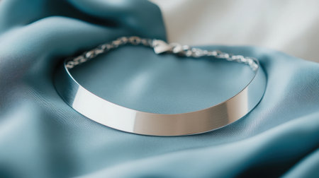 This image features an elegant silver necklace delicately arranged on soft blue fabric, highlighting its shiny surface and minimalist design. Perfect for fashion and jewelry enthusiasts.