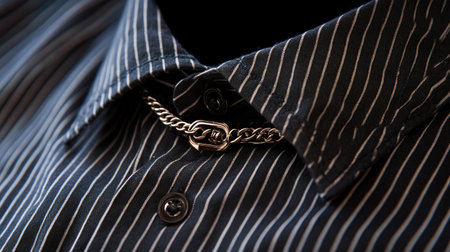 This image showcases a close-up view of a stylish silver chain accessory elegantly positioned on a striped dress shirt collar, emphasizing fashion and detail.