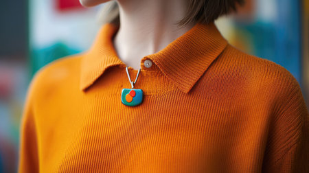 This image features a woman wearing a vibrant orange sweater adorned with a unique pendant necklace, set against a colorful artistic background, showcasing modern fashion and creativity.
