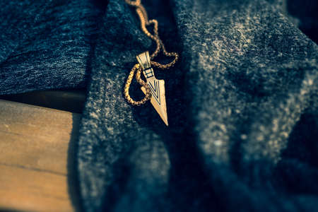 Pendant arrow necklace golden color shoot in a sunny day outside closeup. Selective Focus
