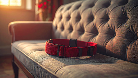 A red plaid dog collar rests on a vintage tufted sofa, bathed in the warm, golden light of a setting sun. This quiet, sentimental scene evokes feelings of love, loyalty, and the cherished memory of a faithful companion waiting patiently at home.