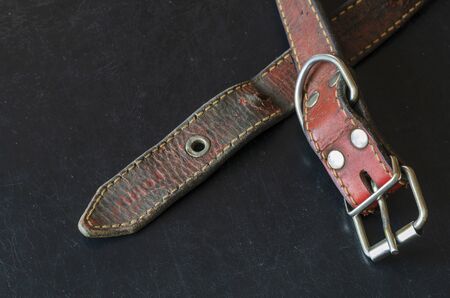 Old red leather dog collar. A close-up of a shabby and cracked dirty collar on a dark table. Love to the animals. Vintage Collectibles. Selective focus.