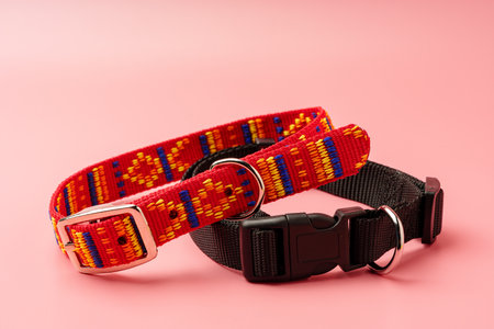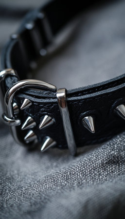 Stylish spiked leather dog collar displayed on a soft, textured fabric background