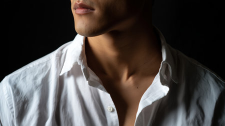Person in white shirt poses against a dark background, creating a dramatic contrast