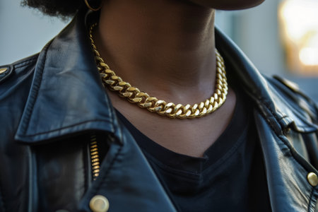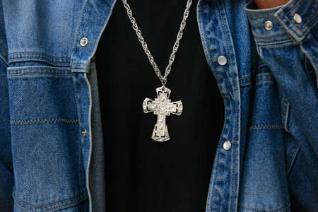 Close-up of a person wearing a thick gold chain necklace with a denim jacket on a blurred background. Lifestyle and fashion concept with copy space. Design for fashion article, advertisement, poster.