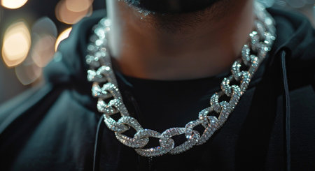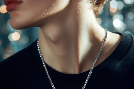 A young man poses with a side profile, highlighting his stylish necklace. The backdrop sparkles, enhancing the fashion theme in a modern, chic environment.