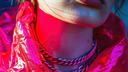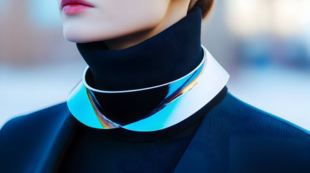 A model displays an elegant reflective collar with a chic turtleneck, radiating style.
