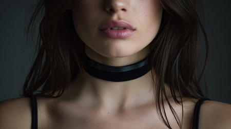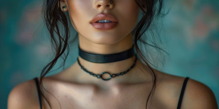 Beautiful woman with a long hair and sensual lips, showing her neck with a choker jewelry on it. Naked flawless skin (collarbones), soft day light, neutral gray background. Square picture