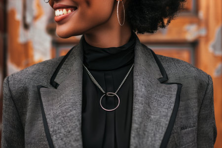 Vintage-Inspired Fashion Detail of Woman Wearing Layered Necklaces and Patterned Jacket