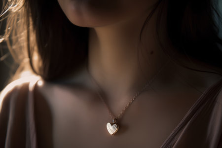 A captivating portrait of a woman in a cozy sweater, showcasing a heart pendant necklace. The warm autumn colors and soft light create a serene and inviting atmosphere.