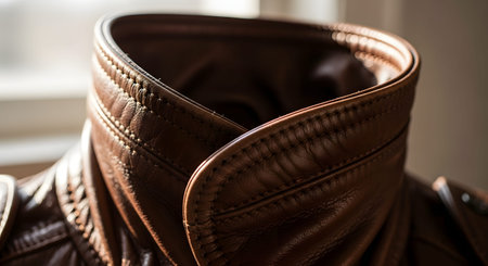 A macro shot of a brown leather jacket collar, highlighting the high-quality texture and precise stitching. The image focuses on the craftsmanship and rugged style of the garment.