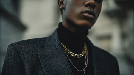 A stylish young individual in a dark suit and layered gold jewelry poses confidently outdoors, embodying modern elegance in an urban environment.